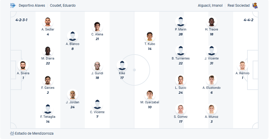 Sociedad đang đứng thứ 9 trên bảng xếp hạng, thành tích kém hơn so với những những họ làm được mùa trước (đứng thứ 6). Với vị trí này và số điểm như hiện tại (42 điểm) thì cơ hội để đội bóng của HLV Imanol Alguacil dự cup Châu Âu là không cao và có lẽ họ không còn nhiều điều để phấn đấu trong các trận còn lại của mùa giải. Phong độ của Sociedad cũng không hề tốt khi chỉ thắng 2/6 vòng gần nhất, với phong độ này thì chuyến làm khách trên sân của Alaves đang rất quyết tâm trụ hạng sẽ rất khó khăn. Nhiều khả năng Sociedad sẽ không thể có điểm ra về.