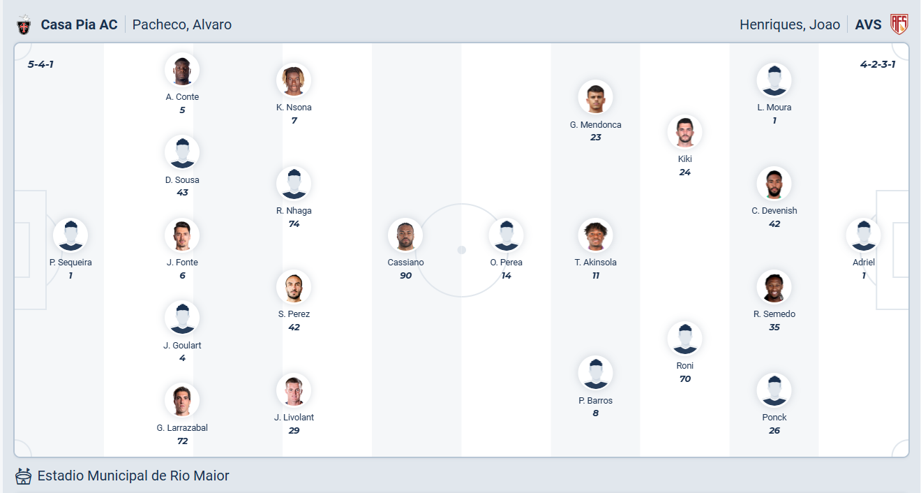 Casa Pia đứng thứ 9 mùa trước, vị trí không đến nỗi tệ so với tiềm lực của đội bóng này. Mùa giải năm nay mọi thứ đang diễn ra không thuận lợi với thầy trò HLV Álvaro Pacheco, 2 trận thua liên tiếp vừa qua khiến họ tụt xuống vị trí thứ 16 và đối mặt với nguy cơ xuống hạng. Hơn lúc nào hết, các cầu thủ Casa Pia cần một chiến thắng ở vòng đấu thứ 19 này để cải thiện thứ hạng, việc chỉ phải gặp đội bóng cuối bảng AVS là cơ hội không thể tốt hơn và nhiều khả năng Casa Pia sẽ chơi đủ tốt để có 3 điểm trận này.