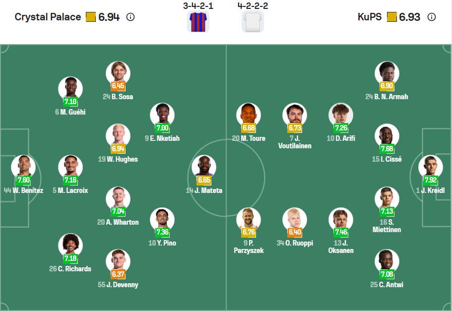 KuPS là đội bóng mạnh của Phần Lan nhưng khi ra đấu trường châu lục thì họ chỉ là đội bóng yếu, không có thành tích gì nổi bật. Việc rớt xuống Conference League từ Champions League cho thấy điều đó và ngay cả ở hạng đấu này thì đội bóng của HLV Jarkko Wiss vẫn gặp rất nhiều khó khăn. Họ đang có 6 điểm sau 5 trận và đứng thứ 25 trên bảng xếp hạng, vị trí sẽ bị loại. Để có vé đi tiếp thì các cầu thủ KuPS cần giành chiến thắng ở trận đấu cuối cùng này, tuy nhiên chuyến làm khách trên sân của đội bóng mạnh hơn và cũng rất cần điểm như Crystal Palace sẽ vô cùng khó khăn, nhiều khả năng KuPS sẽ không thể hiện được gì nhiều và để thua với tỉ số đậm.