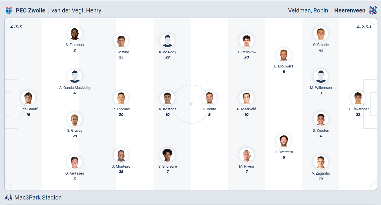 Heerenveen đứng thứ 9 mùa giải trước, vị trí đúng bằng những gì họ đang có được ở mùa giải này. Phong độ của thầy trò HLV Robin Veldman thời gian gần đây không hề ổn định, họ chỉ thắng 2/5 vòng gần nhất. Khoảng cách với các đội xung quanh là rất nhỏ nên nếu không giành kết quả tốt thì Heerenveen sẽ rất dễ tụt xuống vị trí sâu hơn trên bảng xếp hạng. Chính vì vậy họ cần một kết quả tốt ở vòng đấu này, Heerenveen cần 3 điểm hi đến làm khách trên sân Zwolle. Trước đối thủ được đánh giá yếu hơn và đang không có phong độ cao thì nhiều khả năng Heerenveen sẽ ra về với 3 điểm trọn vẹn.