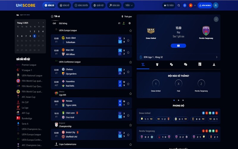 Giao diện của Uniscore được thiết kế trực quan và dễ sử dụng, phù hợp với mọi đối tượng người dùng. Bạn chỉ cần vài cú nhấp chuột là có thể biết ngay kết quả của bất kỳ trận đấu nào bạn quan tâm. Dù là trên máy tính hay điện thoại di động, việc theo dõi kết quả bóng đá chưa bao giờ đơn giản đến vậy.